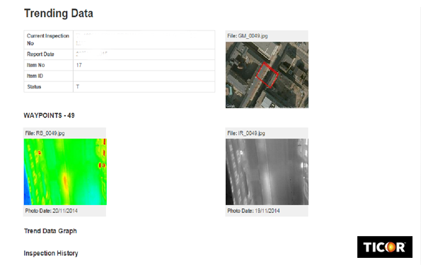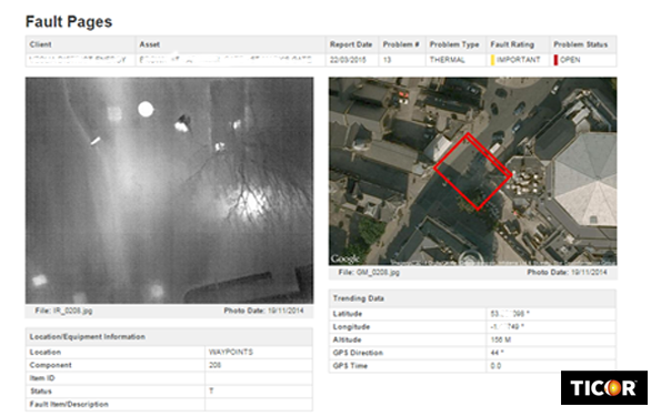 The UAV drone can be programmed to fly specific routes utilising GPS positioning all the while capturing high resolution thermal and visual images. These images are recorded with Latitude, Longitude, Altitude, GPS Direction and GPS Time. All of these images, regardless of fault are efficiently imported into our WEBCOR™ system which then efficiently organises this data. Assessment is carried out to extract potential problems and the exact positioning is applied allowing ground teams to mobilise and investigate the anomaly. This procedure eliminates costly large scale investigative actions by pin-pointing areas of concern.
